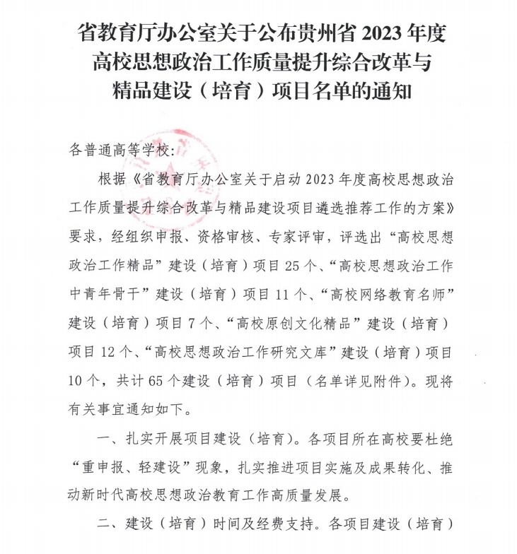根据《省教育厅办公室关于启动2023年度高校思想政治工作质量提升综合改革与精品建设项目遴选推荐工作的方案》要求,经组织申报、资格审核、专家评审,评选出“高校思想政治工作精品”建设(培育)项目25个、“高校思想政治工作中青年骨干”建设(培育)项目11个、“高校网络教育名师”建设(培育)项目7个、“高校原创文化精品”建设(培育)项目12个、“高校思想政治工作研究文库”建设(培育)项目10个,共计65个建设(培育)项目。bwin必赢在其中获批三个省级培育项目。(文/图:学生记者 秦耀)