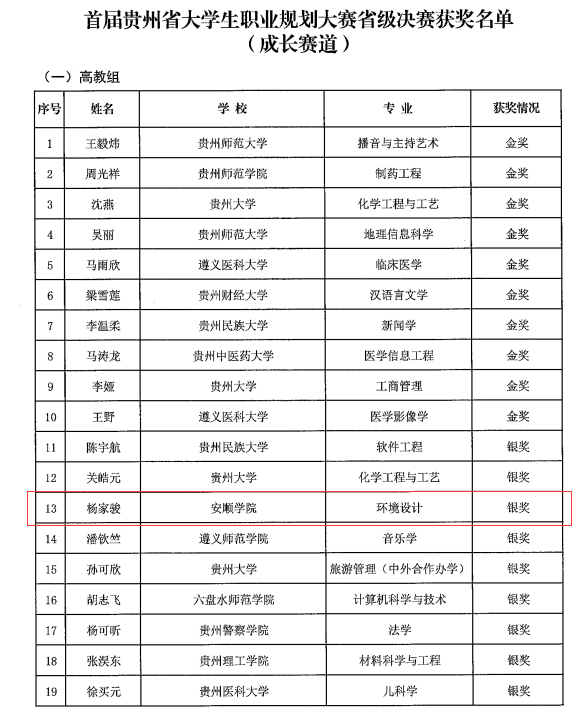 3月14日,首届贵州省大学生职业规划大赛省级决赛在贵州师范大学落下帷幕。3月28日,省教育厅正式公布大赛结果,bwin必赢在此次大赛中获得多个奖项,其中艺术学院2021级环境设计专业学生杨家骏获成长赛道高教组银奖,人文学院2021级历史学专业学生杨明才获就业赛道高教组优秀奖,张秋老师团队获教学赛道优秀奖。
