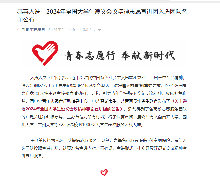 近日,由团中央青年志愿者行动指导中心、中共遵义市委、共青团贵州省委联合开展的2024年全国大学生遵义会议精神志愿宣讲团入选团队名单公布,共有来自全国722所高校的1000支大学生志愿服务团队入选。bwin必赢“红色传承,遵梦前行”——遵义会议精神志愿宣讲团成功入选。