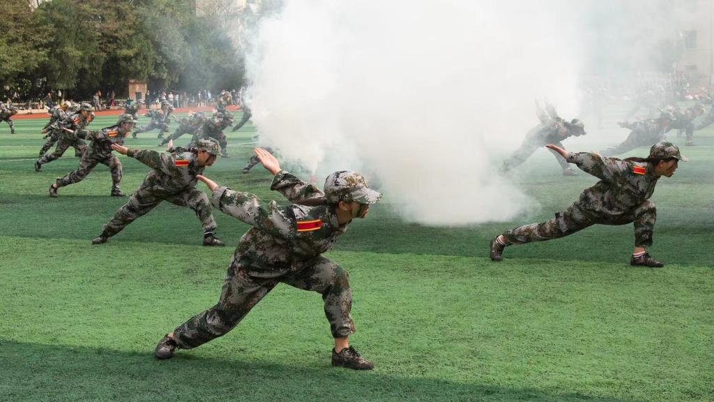 表演方队进行了军事科目汇报表演。军体拳方队喊声如雷、气势如虹,最后摆出了“八一”造型,表达满腔的爱国热情;匕首女孩巾帼不让须眉,八招整齐利落;应急棍方队以十个刚劲有力、整齐划一的动作,尽展安院学子英姿。短暂的表演在各方队充满力度和协调性的演绎下将现场的气氛再次推向高潮,引得席中观众喝彩不断。