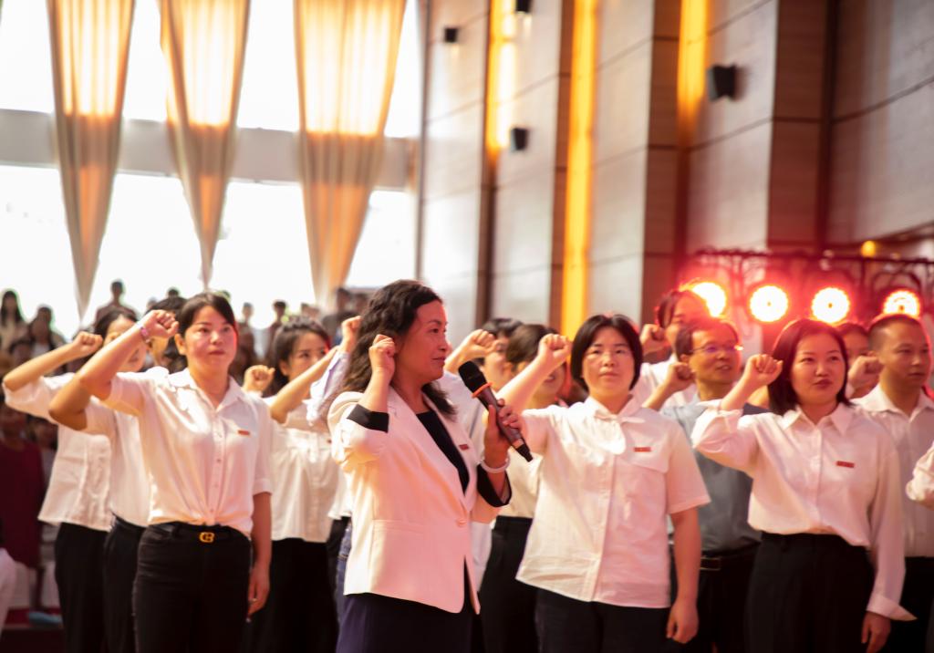 在曾丽的带领下,2024年校级表彰优秀个人、新教师及全体教职工共同重温教师誓词。