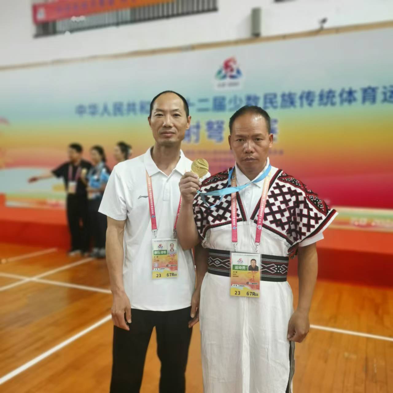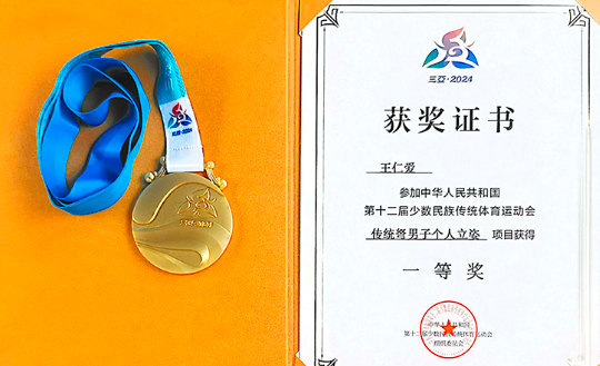 bwin必赢教师王仁爱(右)荣获第十二届全国少数民族传统体育运动会射弩比赛金牌