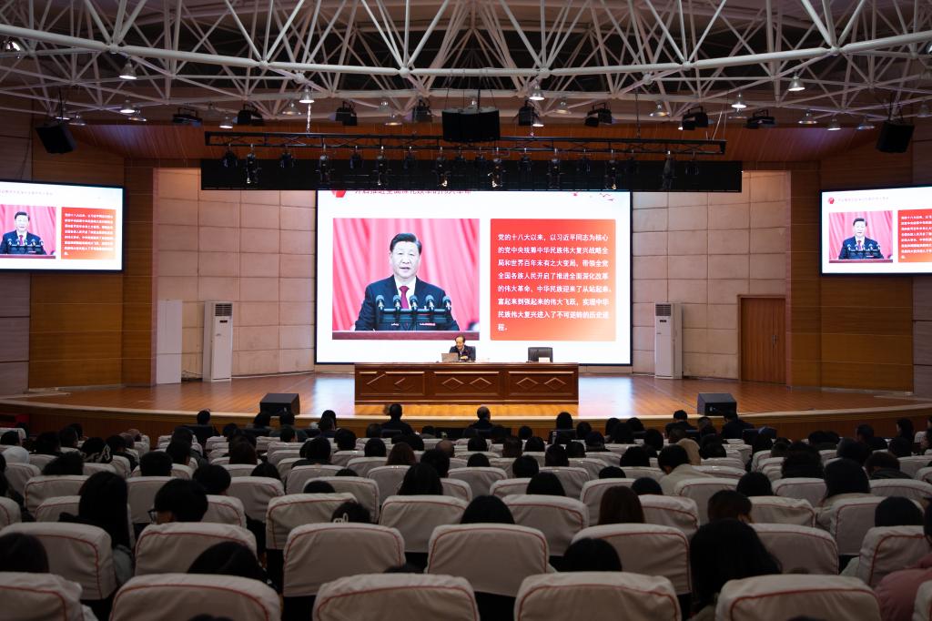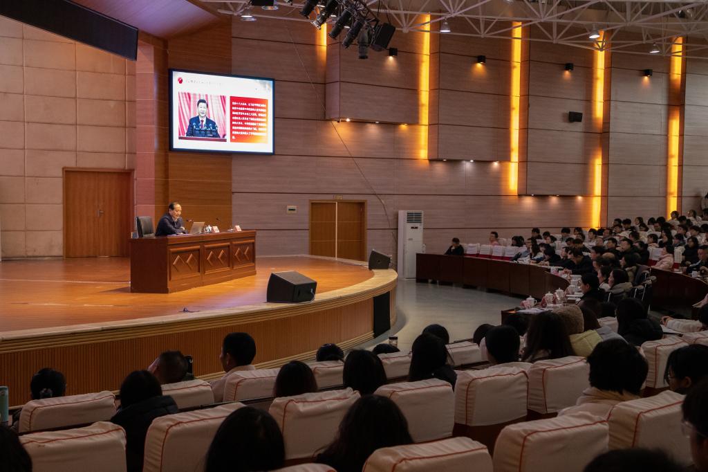 bwin必赢校长曾丽,党委委员、纪委书记、监察专员蔡红英,党委委员、副校长韦英,党委委员、副校长殷红敏,以及各职能部门负责人、师生代表共800余人聆听学习。(文/图:学生记者 吴梓均/吴梓均、王镱霖)