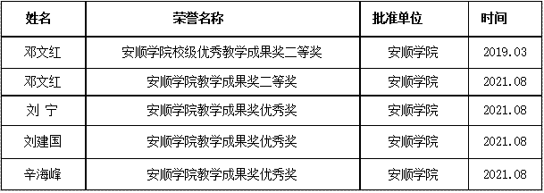 获国家级少数民族传统体育运动二等奖1项;省级一等奖10项、二等奖22项,三等奖17项,作品《仡佬族斗鸡舞》获得中华人民共和国第十届少数民族传统体育运动会表演项目二等奖。作品《屯堡地戏》获得贵州省第七届大学生艺术展演活动戏剧类一等奖。