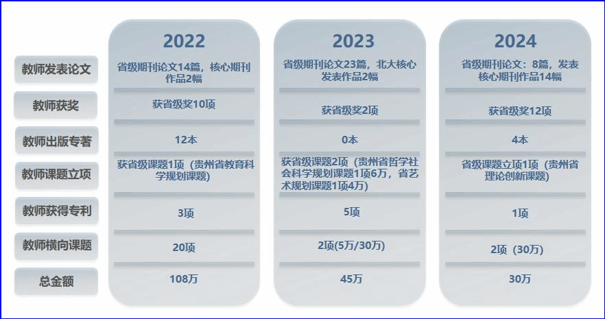 三年来,艺术学院教师出版专著20余部,获省级纵向课题立项5项,横向课题立项24项,课题总经费160余万;发表论文40余篇,教师美术作品和参与各类竞赛获省级奖24项,获国家专利8项;获得省级一流课程(金课)4门。